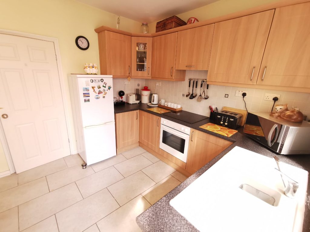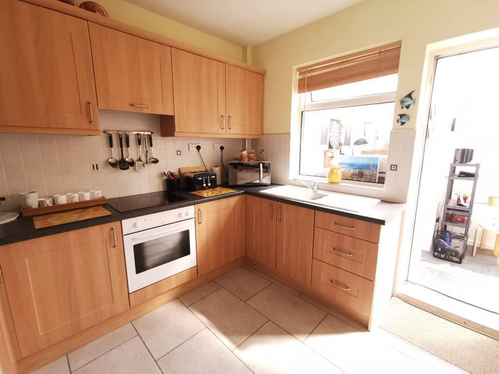 9' 3" x 10' Fitted with a range of wall and base units with work surfaces, 1 ½ bowl sink and drainer, tiled splashbacks, integrated electric oven and hob with extractor fan over, space for fridge freezer, radiator, power points, ceiling light point and double glazed window and door to conservatory.