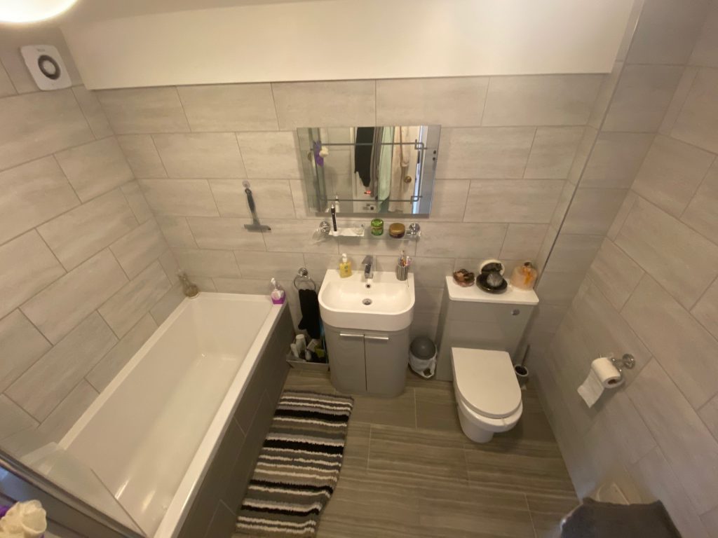 Three piece white suite with panelled bath with Monsoon shower over and handheld shower, wash hand basin set into vanity unit, integrated W.C, fully tiled walls, chrome towel rail radiator and ceiling light point.