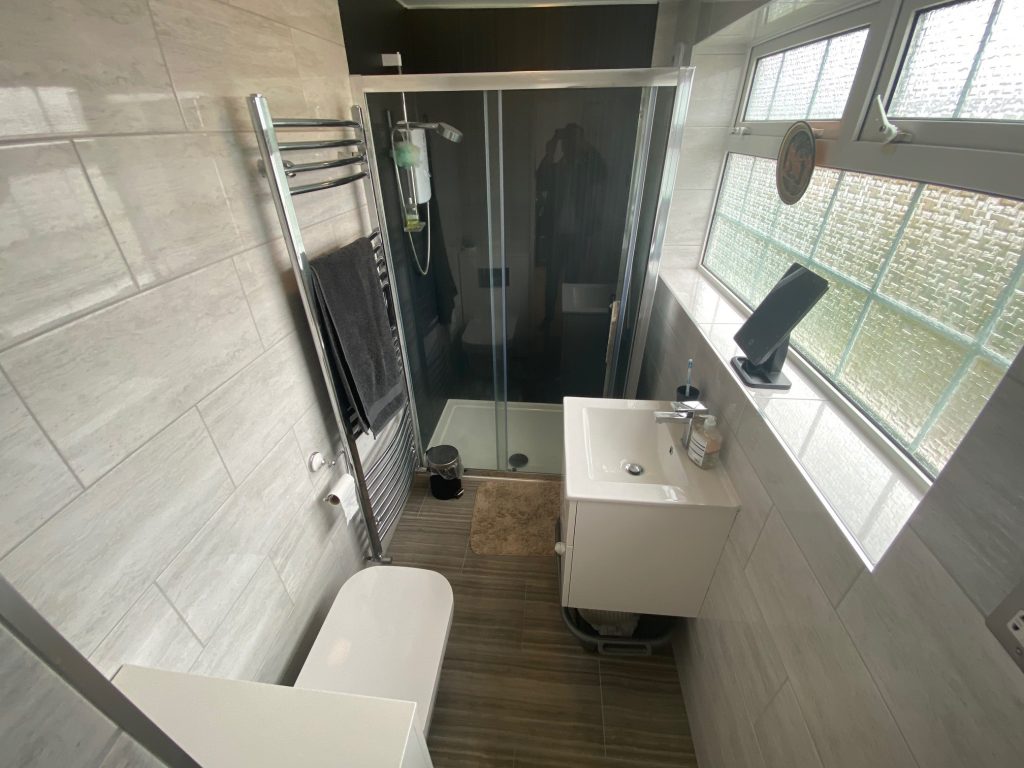 8' x 4'3" Three piece white suite with shower enclosure with electric shower, wash hand basin set into vanity unit, integrated W.C, chrome towel rail radiator, shaver point, double glazed opaque window to the rear and ceiling light point.
