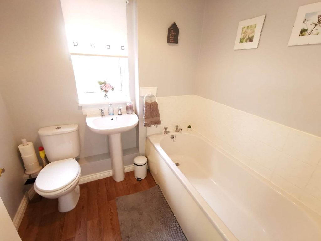 This modern family bathroom offers a three-piece white suite comprising of panelled bath with part wall tiling, low level W.C and pedestal wash hand basin with tiled splashback. With ceiling light point, extractor, radiator and UPVC double glazed window to the side.