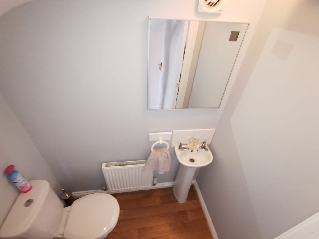 With radiator, ceiling light point, extractor fan, laminate flooring and fitted with a white suite comprising of low-level WC and pedestal wash hand basin with tiled splashback.