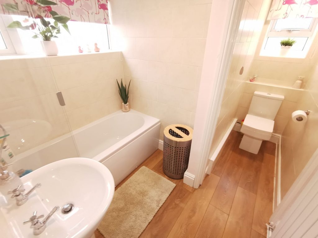7’ x 5’ This stunning bathroom is fitted with a three-piece white suite comprising a panelled bath with shower over and glazed shower screen, pedestal wash hand basin and close coupled W.C. There is full wall tiling, windows to the side and rear and radiator.