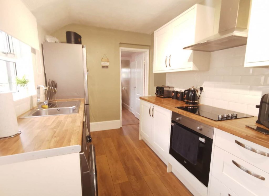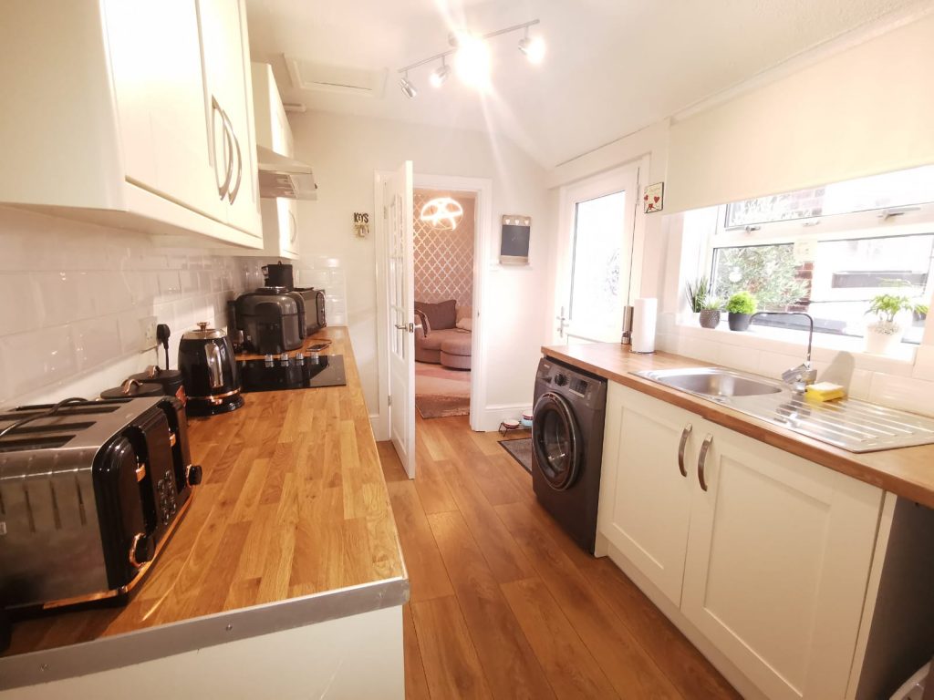 11’1” x 7’1” The bright and airy kitchen has been fitted with a range of wall and base units in a contemporary finish with wooden effect work surfaces and a co-ordinating tiled splashback. The kitchen has UPVC double glazed window and door to the side giving access to the rear garden.