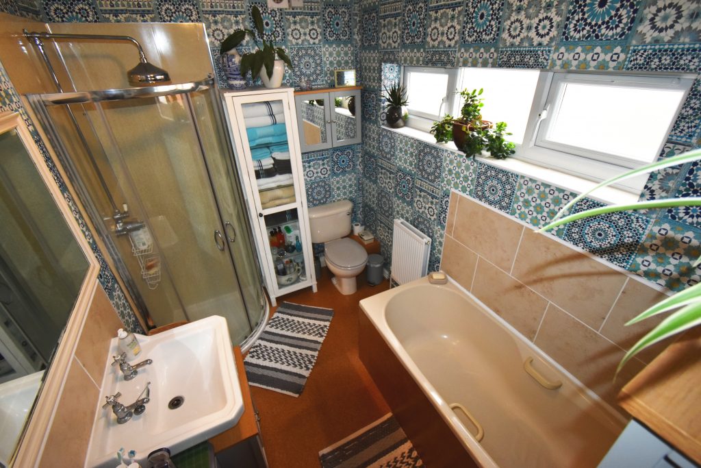 With close coupled W.C, wash hand basin, panelled bath with mixer tap, shower enclosure with rainfall shower, UPVC double glazed window to side, radiator, extractor, wall tiling and ceiling light point.