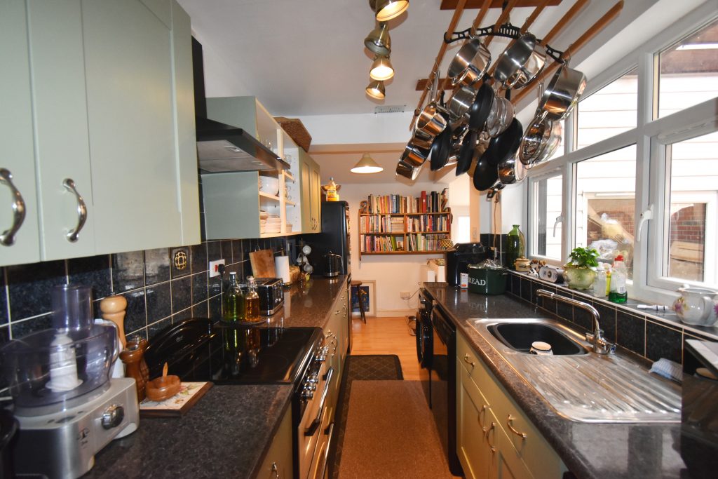 With a range of wall and base units with roll top work surfaces and coordinating tile surrounds, single drainer stainless steel sink with chrome mixer tap, space and plumbing for washing machine, dryer, dishwasher, cooker and fridge-freezer, UPVC double glazed window to side, radiator, power and ceiling light points.