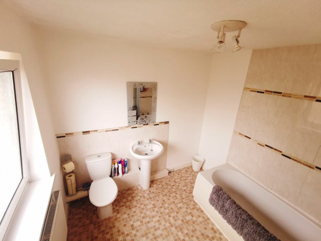 With three-piece suite comprising panelled bath with tiled surround, mixer tap and shower over, close coupled W.C and a pedestal wash hand basin with tiled splash back. There is a radiator, UPVC double glazed opaque window to the rear and ceiling light point.