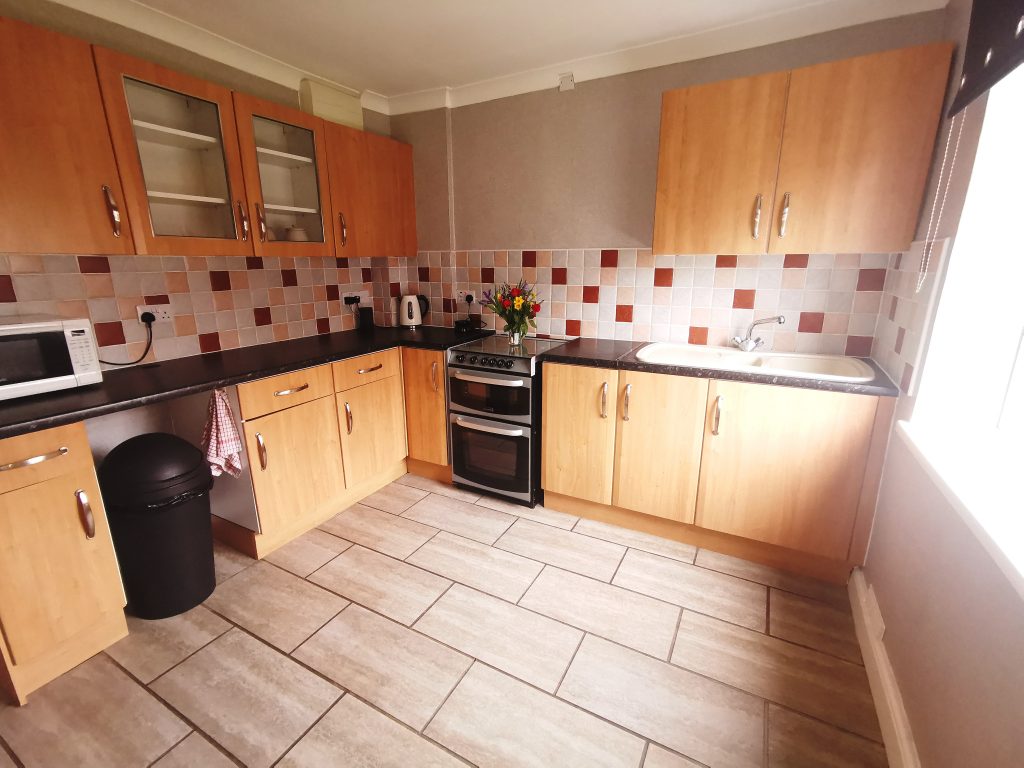 Fitted with a range of wall and base units with roll top work surfaces and coordinated tile surround, 1 ½ bowl ceramic white sink with chrome mixer taps, free standing oven and grill, numerous power points and UPVC double glazed window to the front.