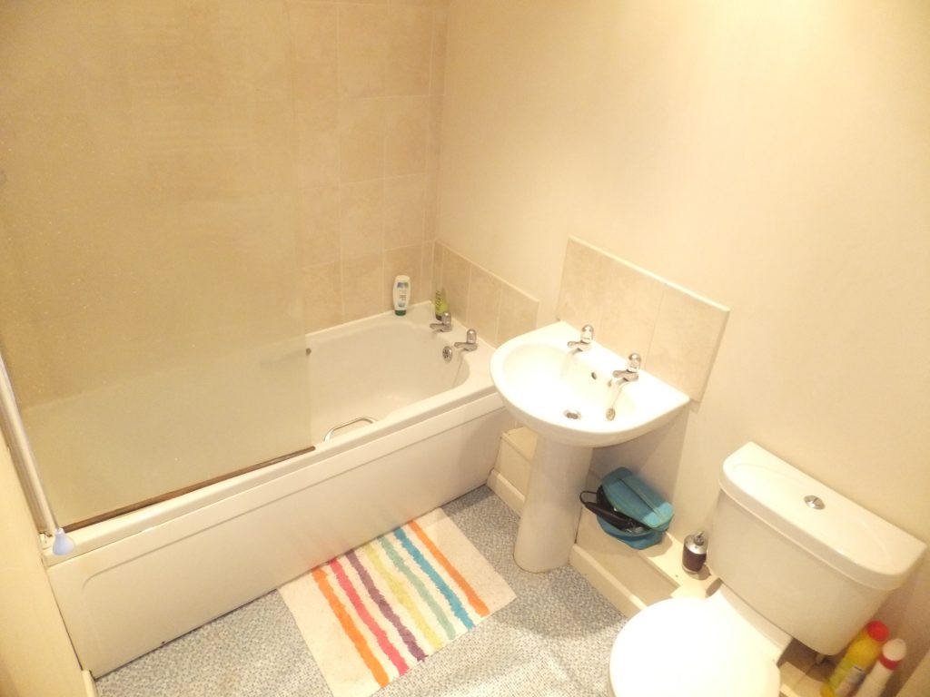 With ceiling spotlights, three piece white suite comprising panel bath with tiled surround and shower over, WC, pedestal wash hand basin and heated towel rail.