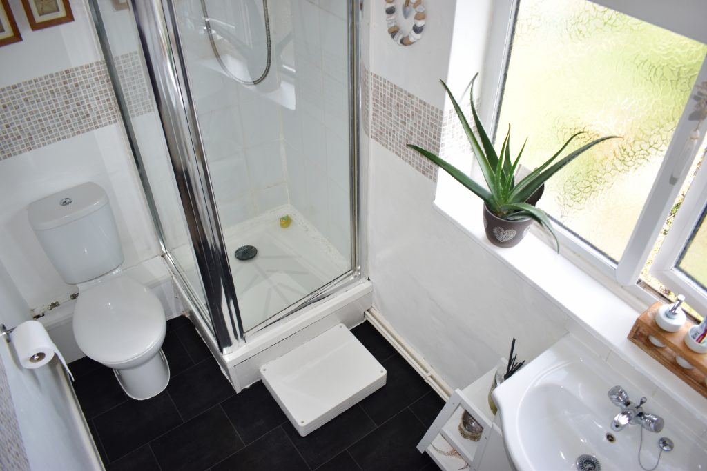 With three-piece suite comprising shower enclosure, close-coupled W.C and a pedestal wash hand basin set into vanity unit. There is full wall tiling, UPVC double glazed opaque window to the rear and ceiling light point.
