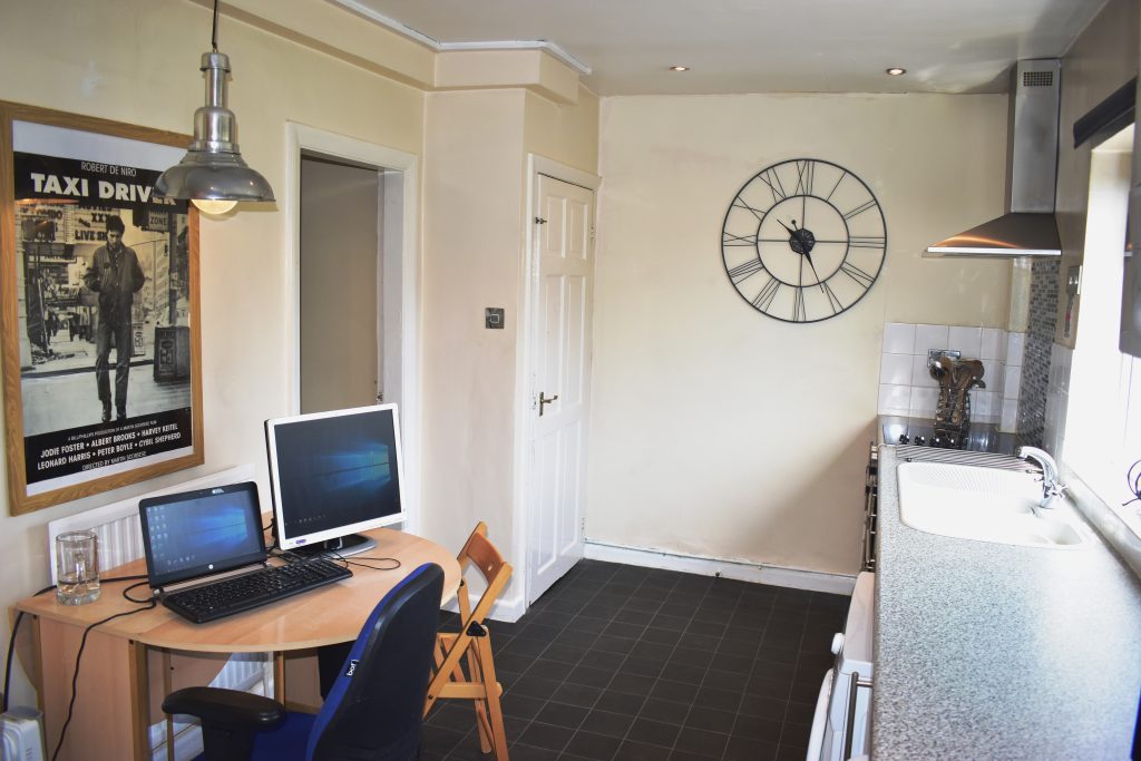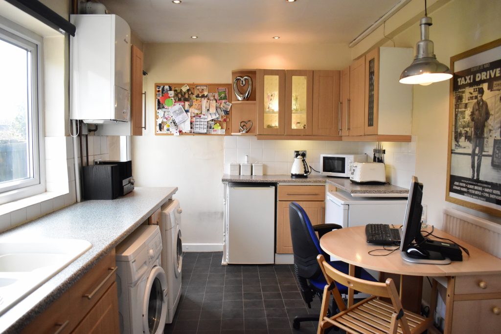 Fitted with a range of wall and base units with roll top work surfaces and coordinated tiled surround, built in electric oven/grill with separate four ring electric hob with stylish splash back and extractor above, 1 ½ composite sink with chrome mixer tap, radiator, ceiling spot lights, UPVC double glazed window to the rear, space for washer and dryer, under stairs storage cupboard and door opening onto the rear garden.