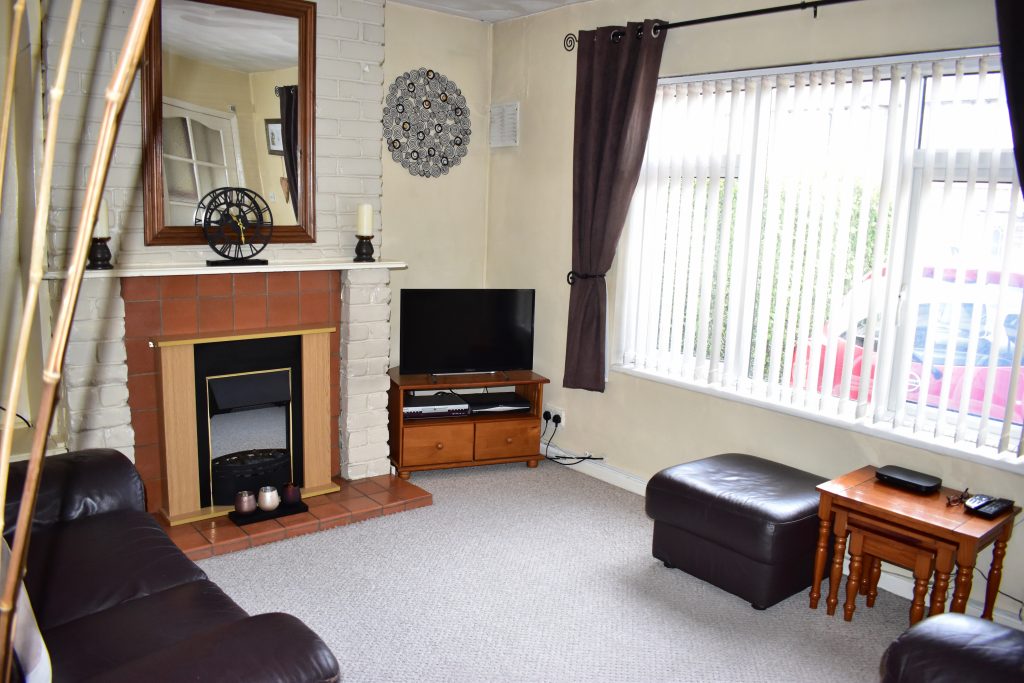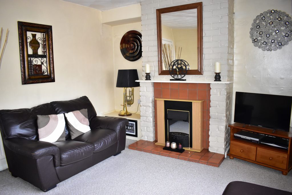 A bright and spacious living room with UPVC double glazed window to the front, feature fireplace with exposed painted brick and electric fire, ceiling light point, power point, thermostatically controlled radiator, TV aerial and telephone point.