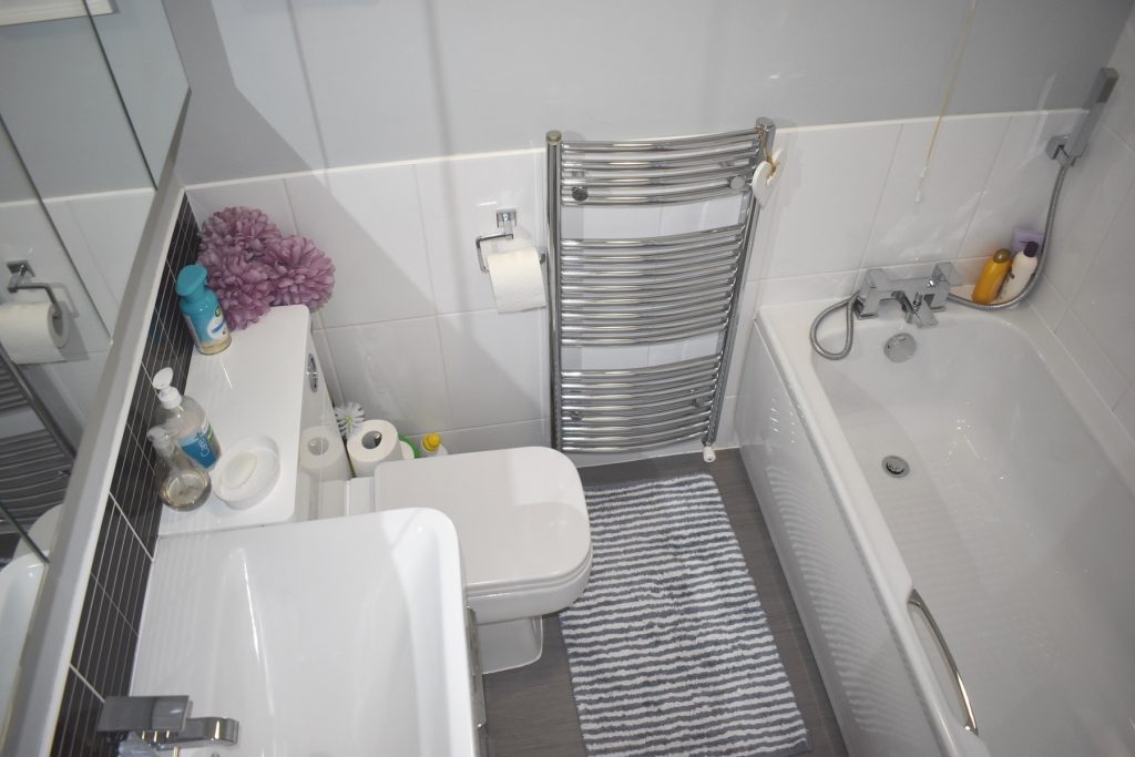 A modern three-piece suite in white comprising of panelled bath with shower over, close coupled W.C, pedestal wash handbasin with mixer tap and towel rail radiator. There is part wall tiling and UPVC double glazed opaque window to the rear.