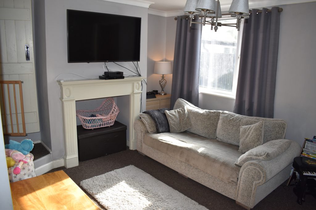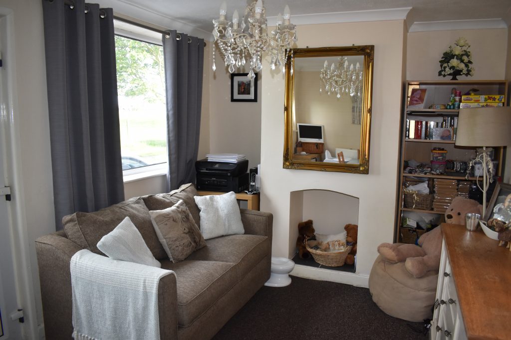 With UPVC double glazed window to the rear, power points, feature fireplace, ceiling light point, radiator and ceiling coving. Stable door to the kitchen and stairs to the first floor.