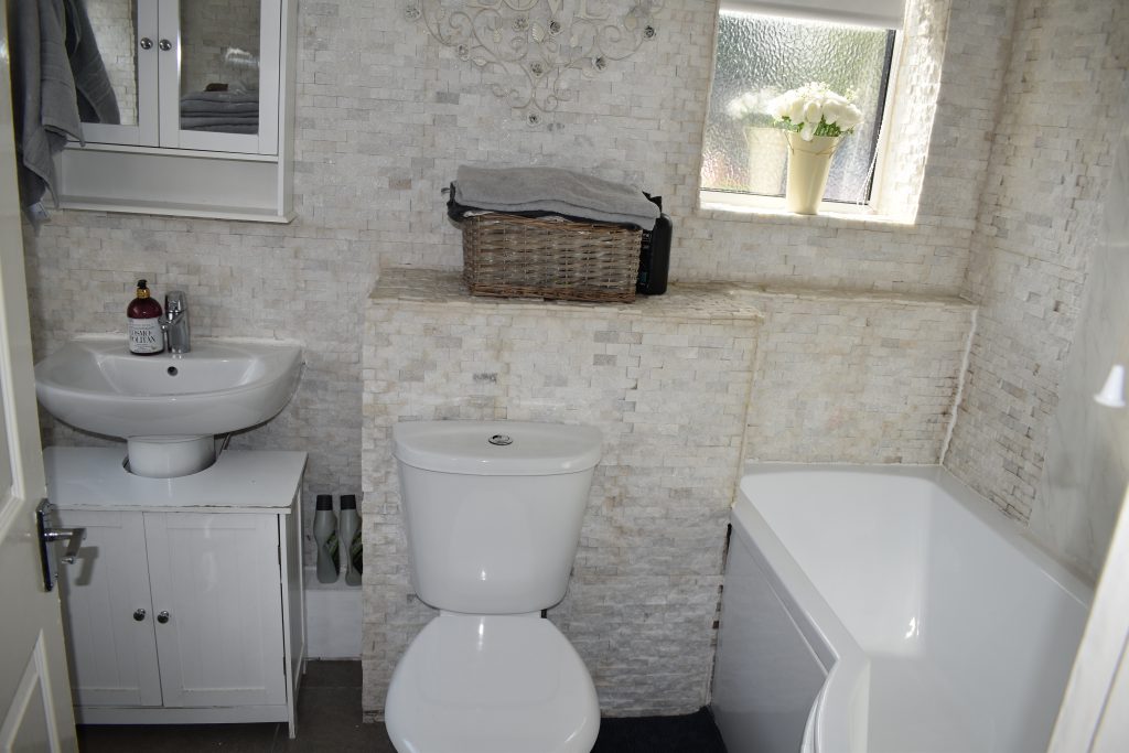 With three-piece white suite comprising sculptured bath with curved shower screen, chrome shower head mixer taps, closed coupled W.C, wash hand basin, radiator, ceiling light point, wall and flooring tiling, UPVC double glazed opaque windows to the rear and side.