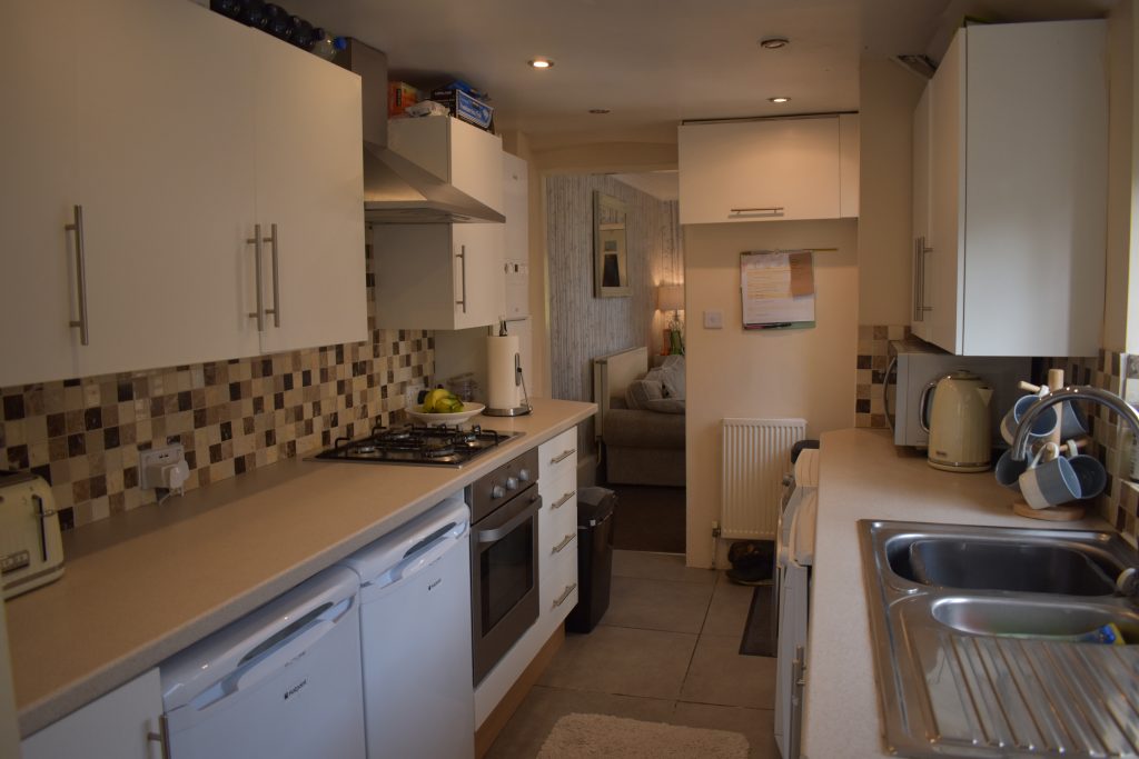 With a range of wall and base units in white with granite effect roll top work surfaces, coordinated tiled surrounds, canopy style illuminated extractor over four ring stainless steel gas hob, integrated stainless steel oven, space for fridge, space for freezer, space and plumbing for washing machine, space and plumbing for dishwasher, 1 ½ bowl single drainer stainless steel sink with chrome mixer taps, UPVC double glazed window to the rear, ceramic floor tiling, radiator, ceiling spot lights and double glazed door opening onto the rear.