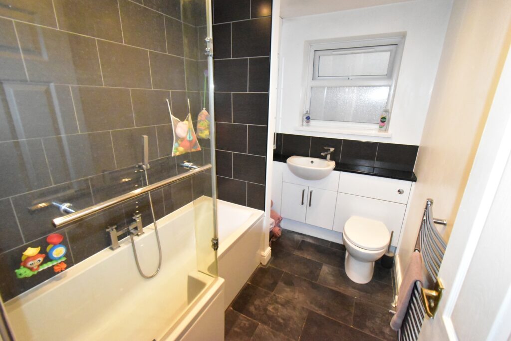 White three piece suite comprising of a wash hand basin built into vanity, W.C. and bath with shower over, part tiled walls, chrome towel radiator and ceiling light points.