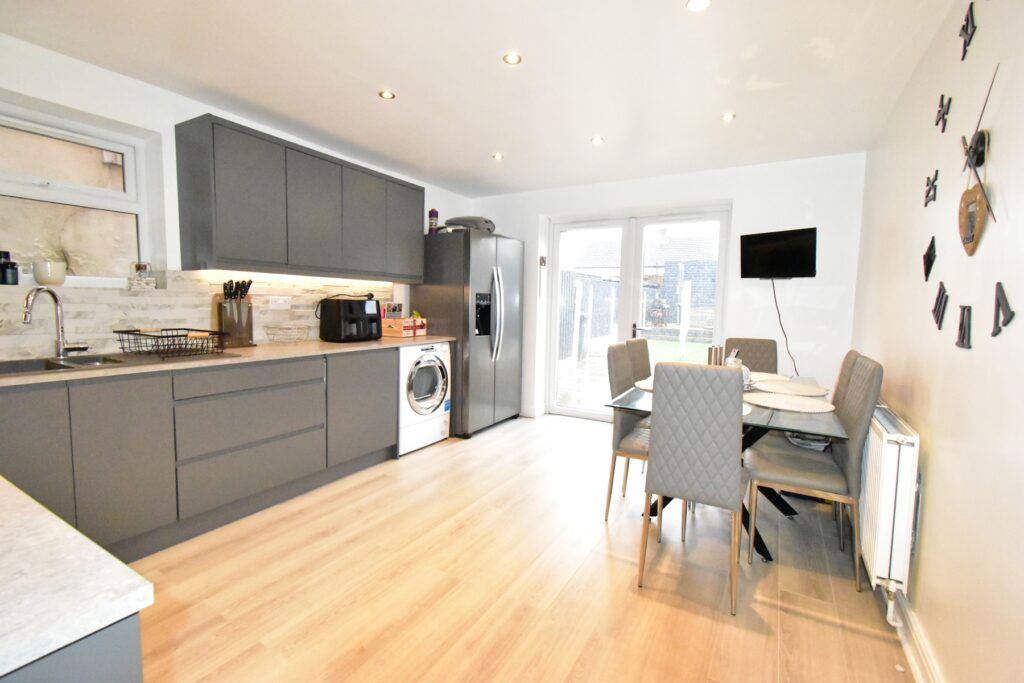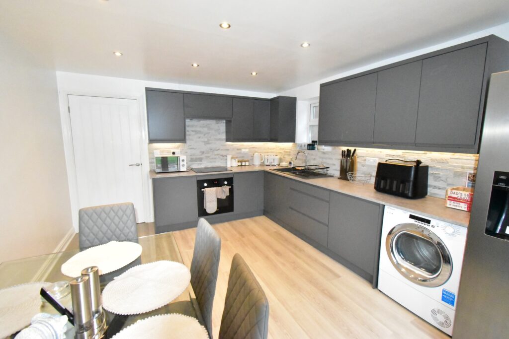Fitted with a range of wall and base units in a grey finish with coordinating work surfaces, part wall tiling, space and plumbing for a washing machine, space and plumbing for a fridge freezer, integrated oven, four ring hob, extractor fan, one and a half bowl single drainer sink with mixer tap, UPVC double glazed window to the side, UPVC double glazed patio doors to the rear, radiator, power points and ceiling spotlights.