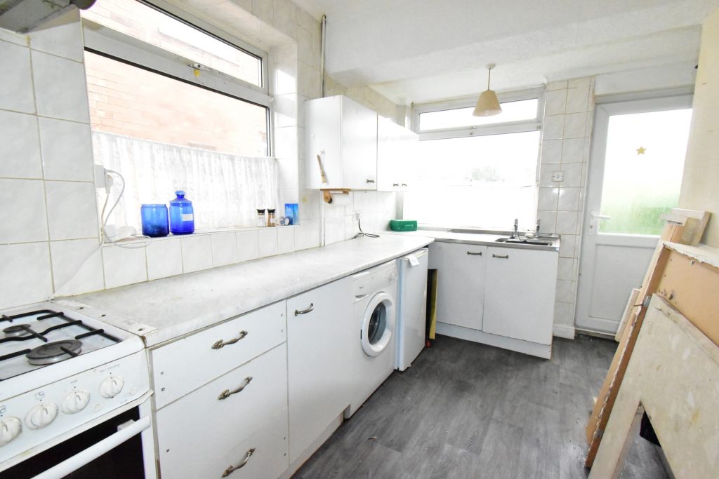 Fitted with a range of wall and base units in a white finish with coordinating work surfaces, part wall tiling, space and plumbing for a fridge/freezer, space and plumbing for a washing machine, space and fittings for a cooker, stainless steel sink with taps, with windows to the side and rear, door to the rear, radiator, power and ceiling spotlights.