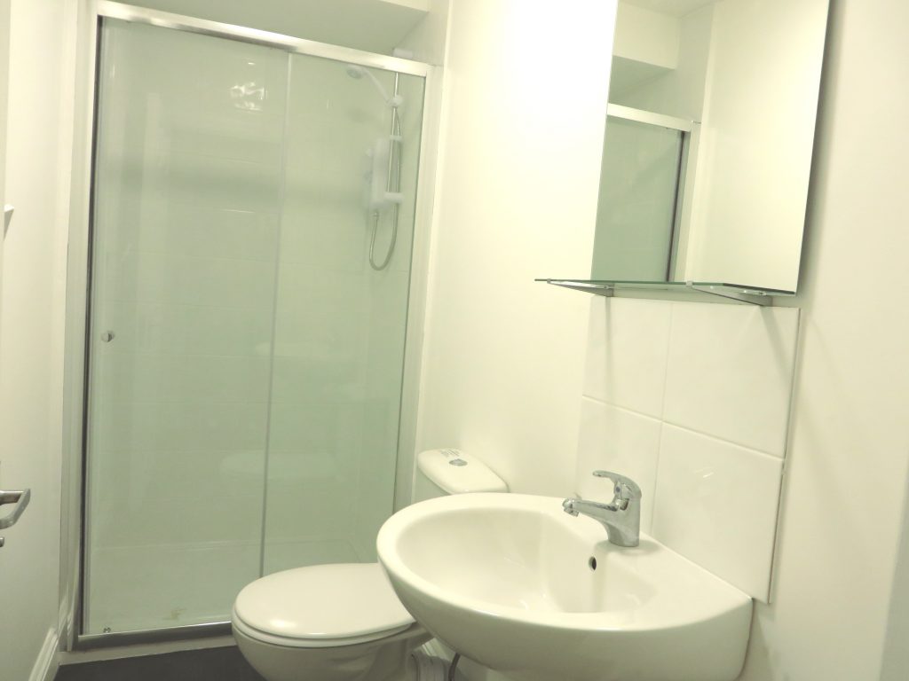 Fully tiled bathroom with double shower cubicle with electric shower, close coupled W.C. and pedestal wash hand basin with tiled splashback.