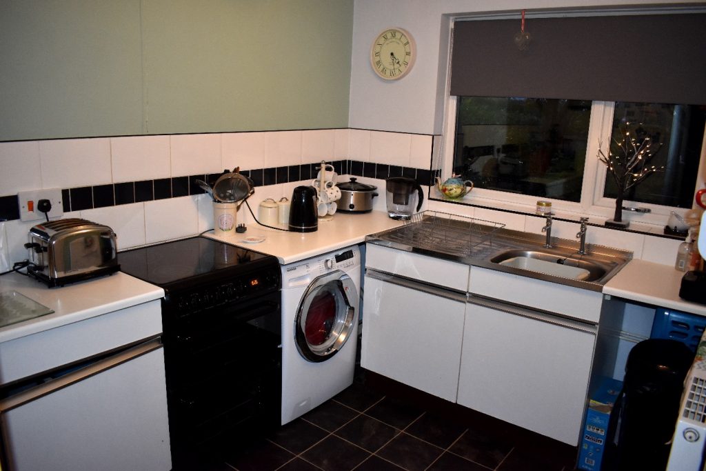 The kitchen is fitted with a range of units with matching works surfaces and tiled splashbacks.