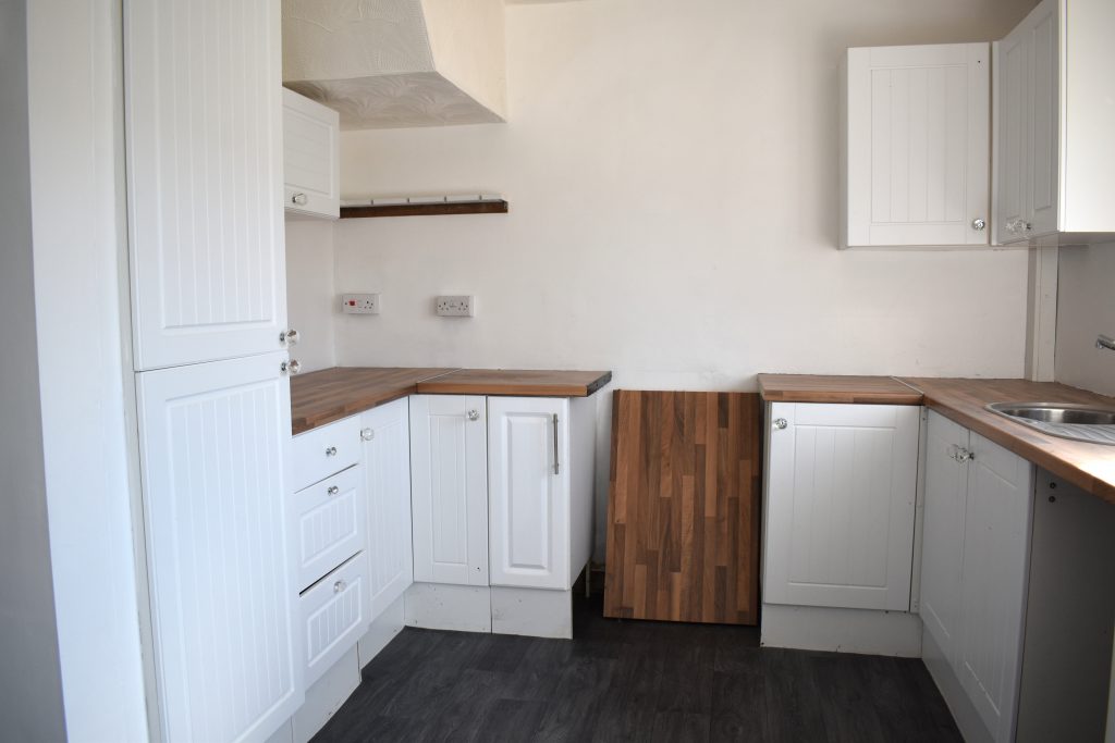 The kitchen is fitted with a range of wall and base units with roll-top work surfaces. With power points, ceiling light point and UPVC double glazed window to the rear.