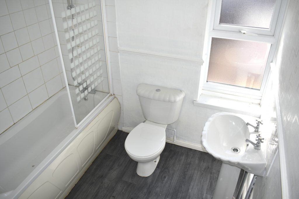 The bathroom is fitted with a three-piece white suite comprising panelled bath with shower over, pedestal wash hand basin and close coupled W.C. With part wall tiling, chrome towel rail radiator, ceiling light point and UPVC double glazed window to the rear.