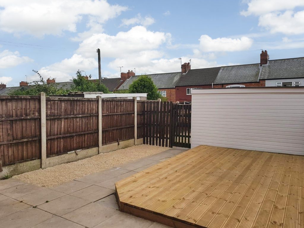 To the rear of the property there is a low-maintenance garden with decking and a garage.