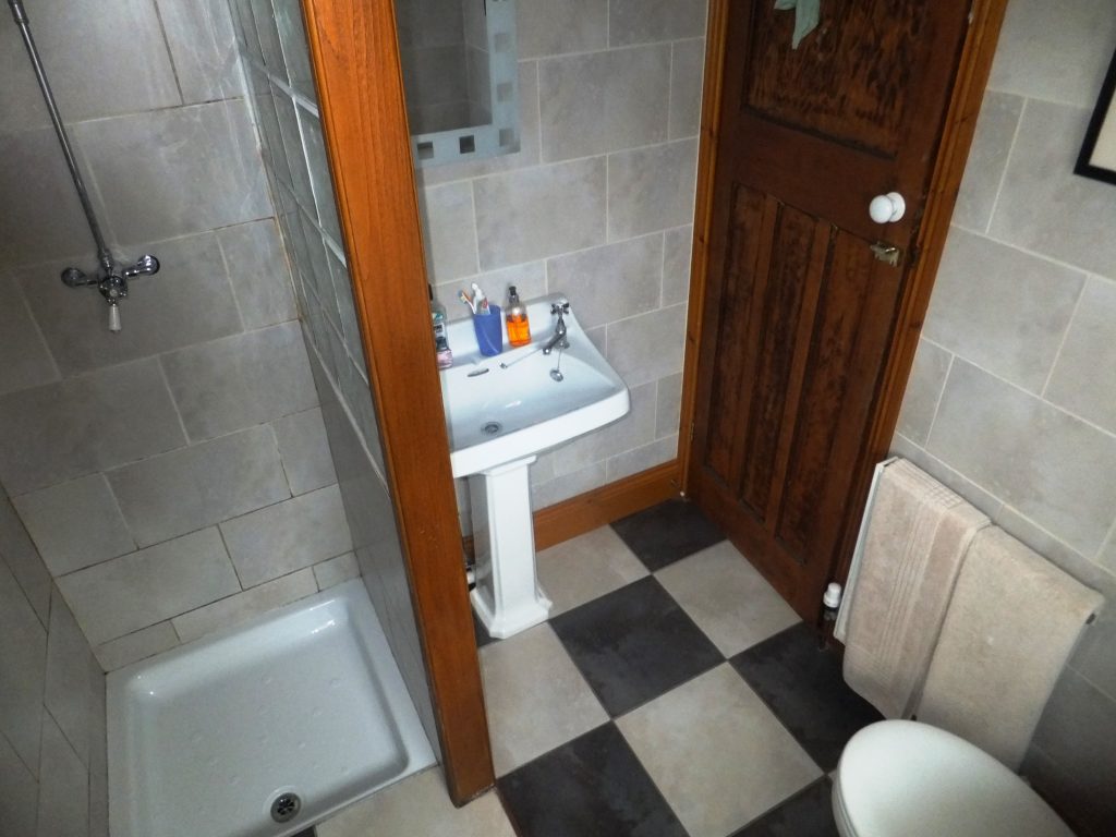 With three piece suite comprising of walk-in shower, pedestal wash hand basin, close coupled W.C, ceiling light point, UPVC double glazed opaque window to the side, wall and floor tiling.