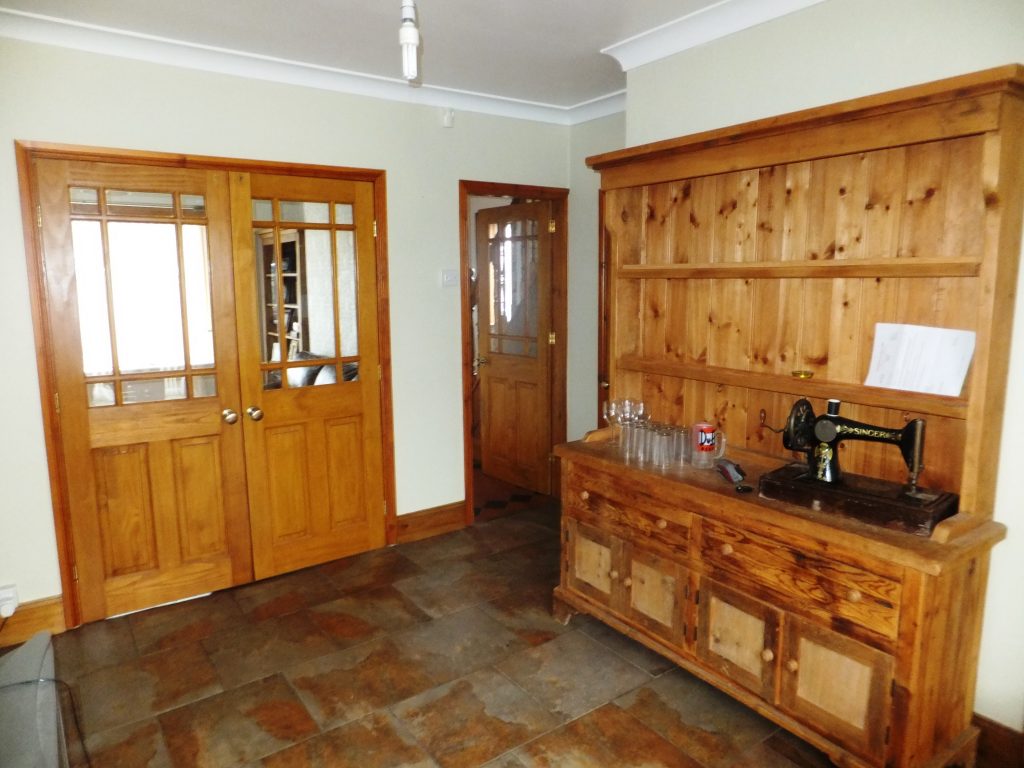 With ceiling coving, ceiling light point, thermostatically controlled radiator, ceramic floor tiling and power points. Panelled door to under stairs storage cupboard which has ceiling light point, double glazed opaque window and fitted shelving.