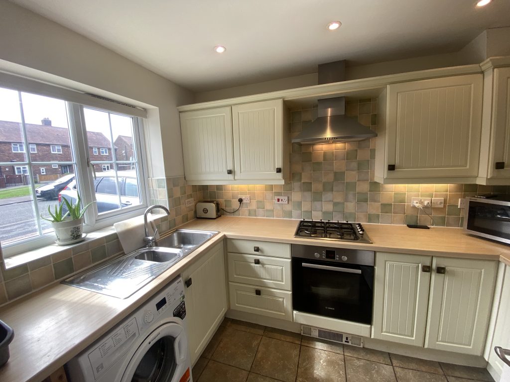 This kitchen is comprehensively and attractively fitted with a range of wall and base units and the wall units have under lighting. There are ceiling spot lights, integrated combi-boiler, illuminated stainless steel canopy style extractor over stainless steel gas hob, integrated stainless steel oven and grill, space and plumbing for washing machine, space and plumbing for dish washer, space for fridge freezer, roll top work surfaces, coordinated tiled surrounds, 1 ½ bowl single drainer stainless steel sink with chrome mixer taps, UPVC double glazed window to the front, ceramic floor tiling and warm air heater.