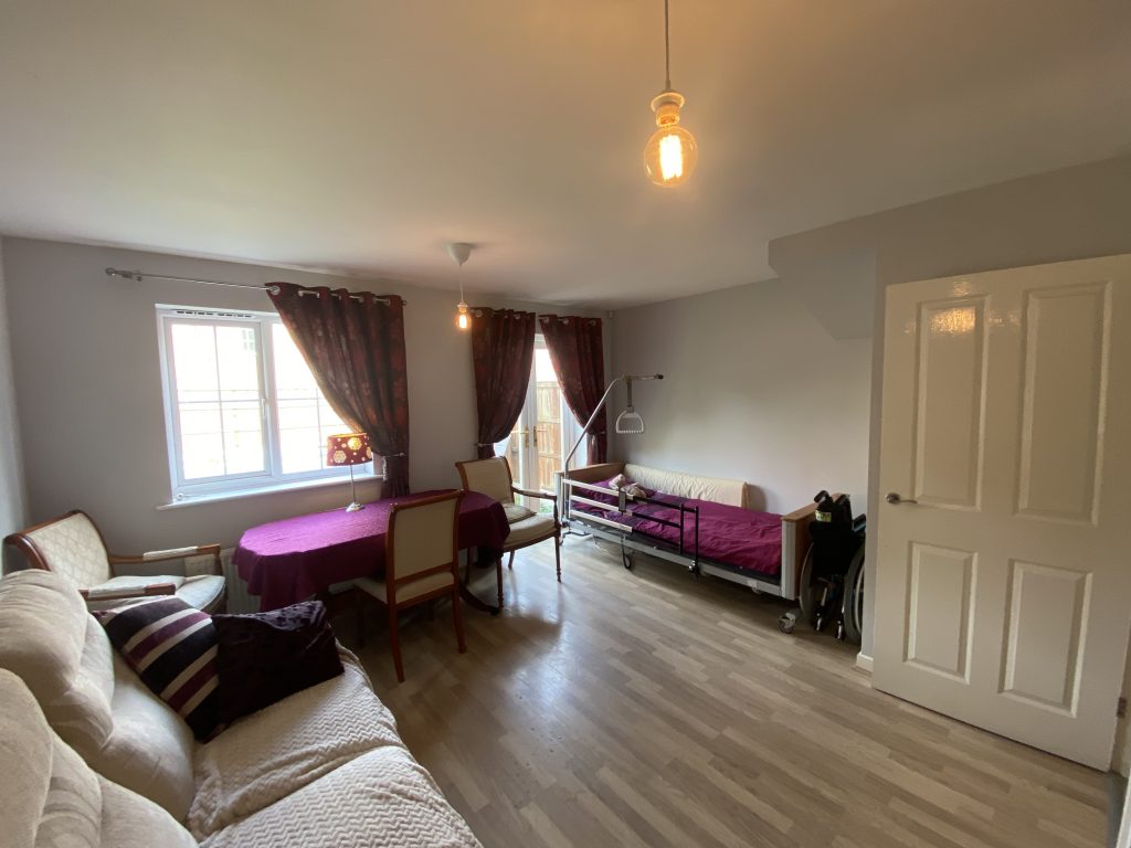 With thermostatically controlled radiator, laminate flooring, ceiling light point, telephone point, power points and stairs to first floor landing.
