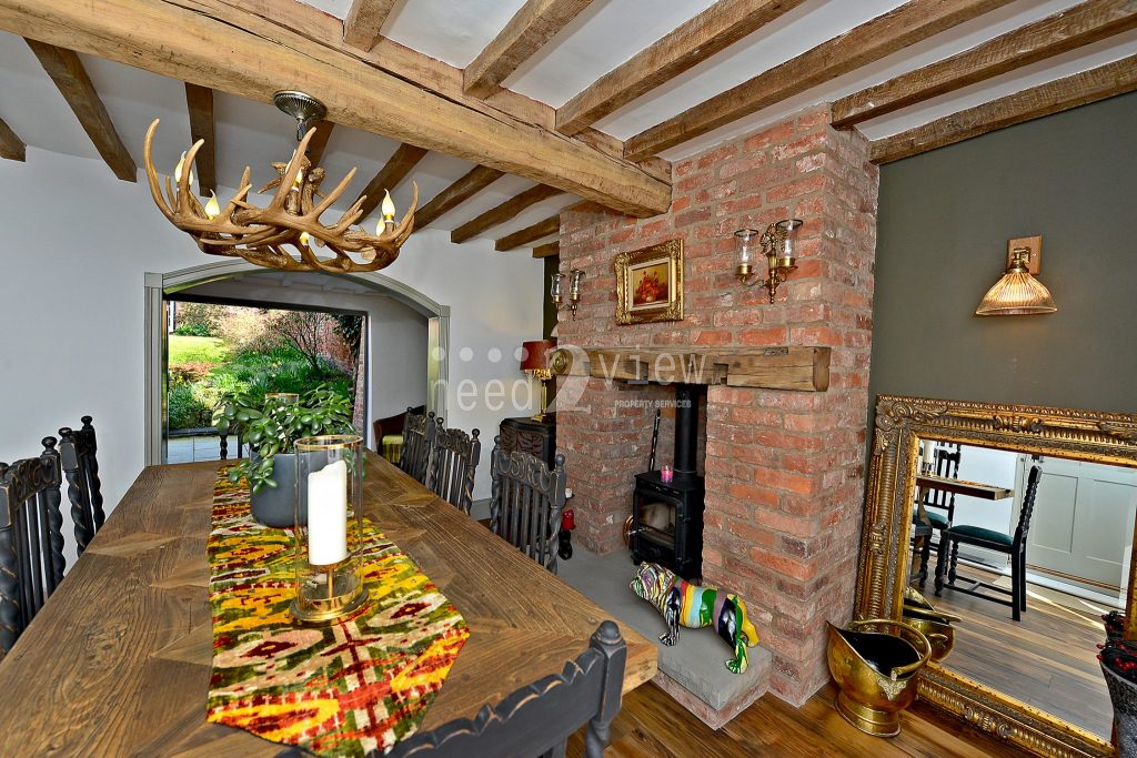 A stunning room perfect for entertaining with traditional features to include oak beams, open fireplace with exposed brickwork and log burner. There are wall light points, ceiling light point, numerous power points, karndean flooring, radiator, and double-glazed bay window to the front.