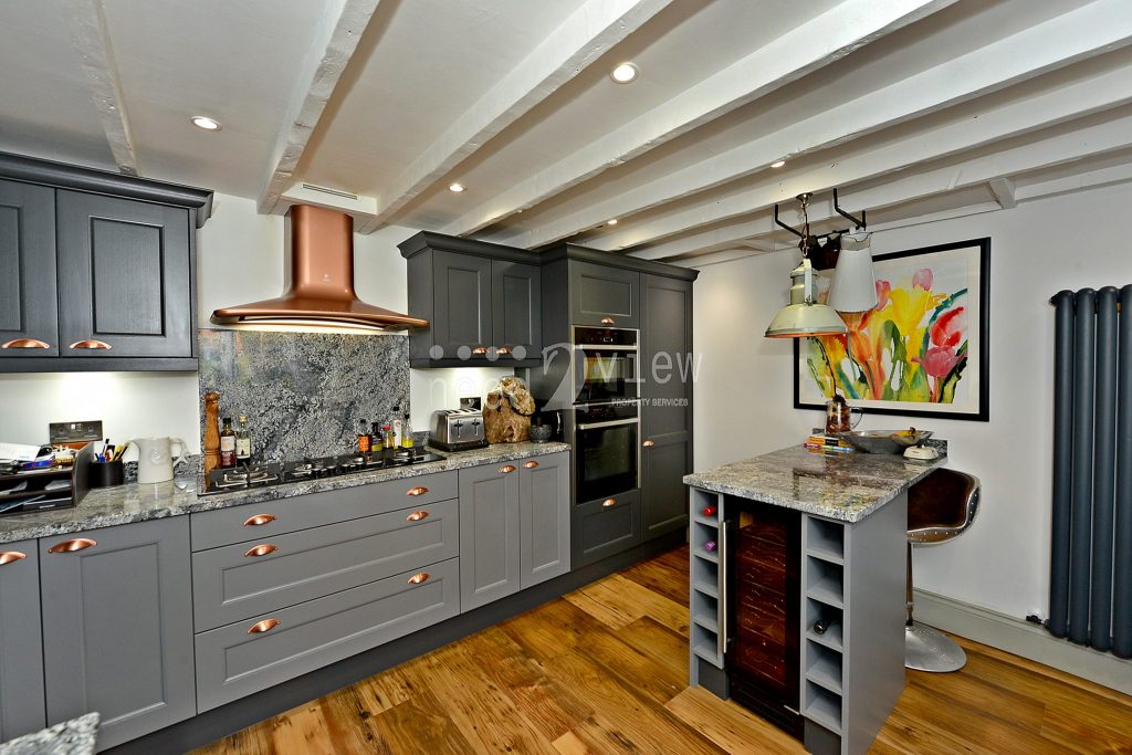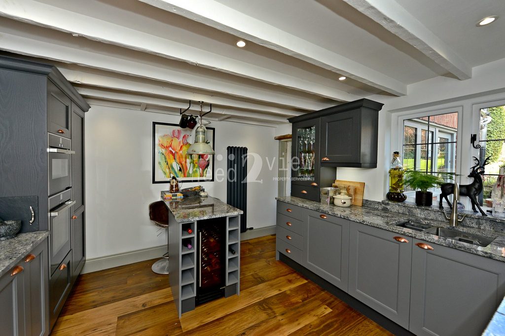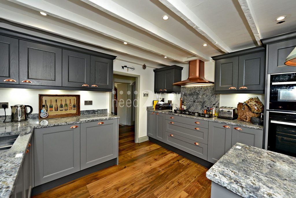 Boasting a newly fitted kitchen with a range of modern shaker style soft close wall and base units in a paired matt grey finish with co-ordinated granite work surfaces and splash-backs. There is plenty of cupboard space providing ample storage and the added benefit of a breakfast bar. With one and a half bowl sink with drainer and a wealth of integrated Neff appliances to include four-ring gas hob with stylish copper extractor fan over, raised double electric oven and grill, built in microwave, integrated wine cooler, integrated dishwasher, and integrated larder style fridge. There are numerous power points, ceiling spotlights, painted beams, vertical radiator, karndean flooring, and window to the rear.