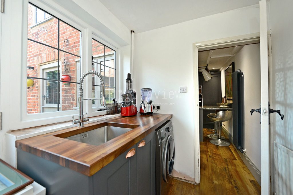 Fitted with a base unit matching that of the kitchen with wooden effect work surface providing space for an under the counter appliance. There is a large sink with chrome extendable mixer tap, ceiling light point, power points, radiator, double glazed and leaded window to the rear, and door opening onto the rear garden.