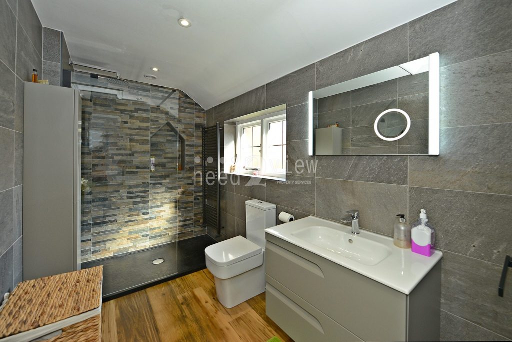 Simply stunning the en-suite has been recently fitted with a modern three-piece suite comprising double width walk-in enclosure with rainfall shower, close coupled W.C and wash hand basin set into vanity unit. There is full wall and floor tiling, ceiling spotlights, heated towel rail, wall mounted heater, extractor fan, wall mounted anti-mist mirror with back lighting, and window to the rear.