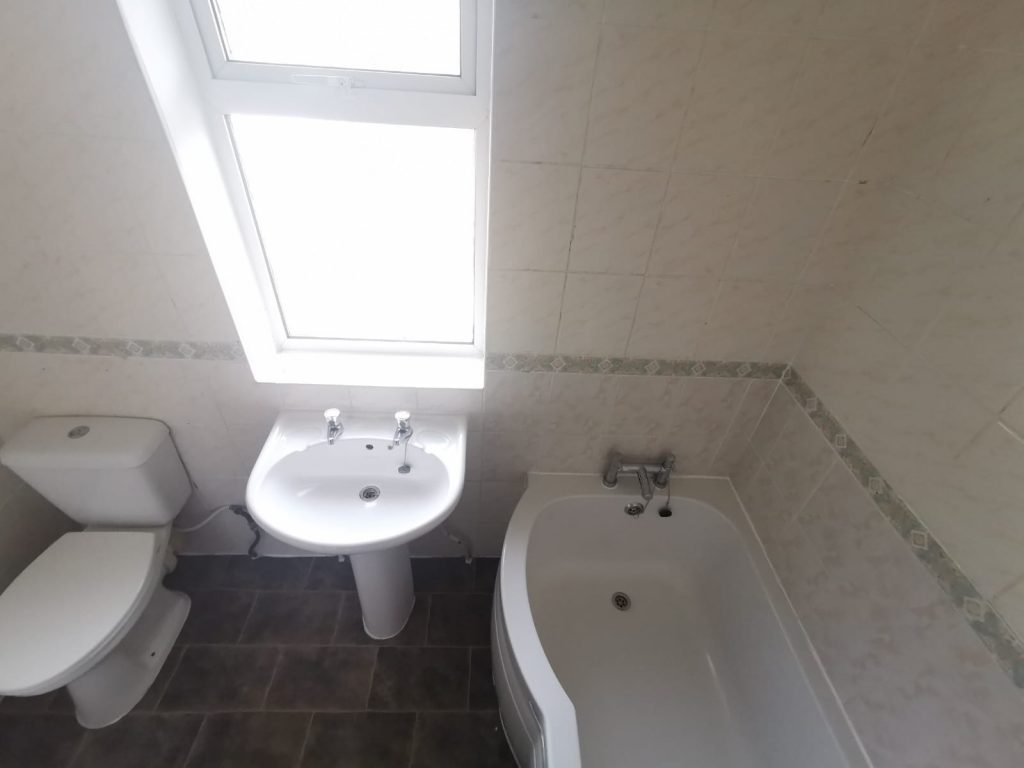 Having a three-piece white suite comprising bath with chrome mixer taps, close coupled W.C. and pedestal wash hand basin, thermostatically controlled radiator, double glazed opaque window to the rear, wall tiling and ceiling light point.