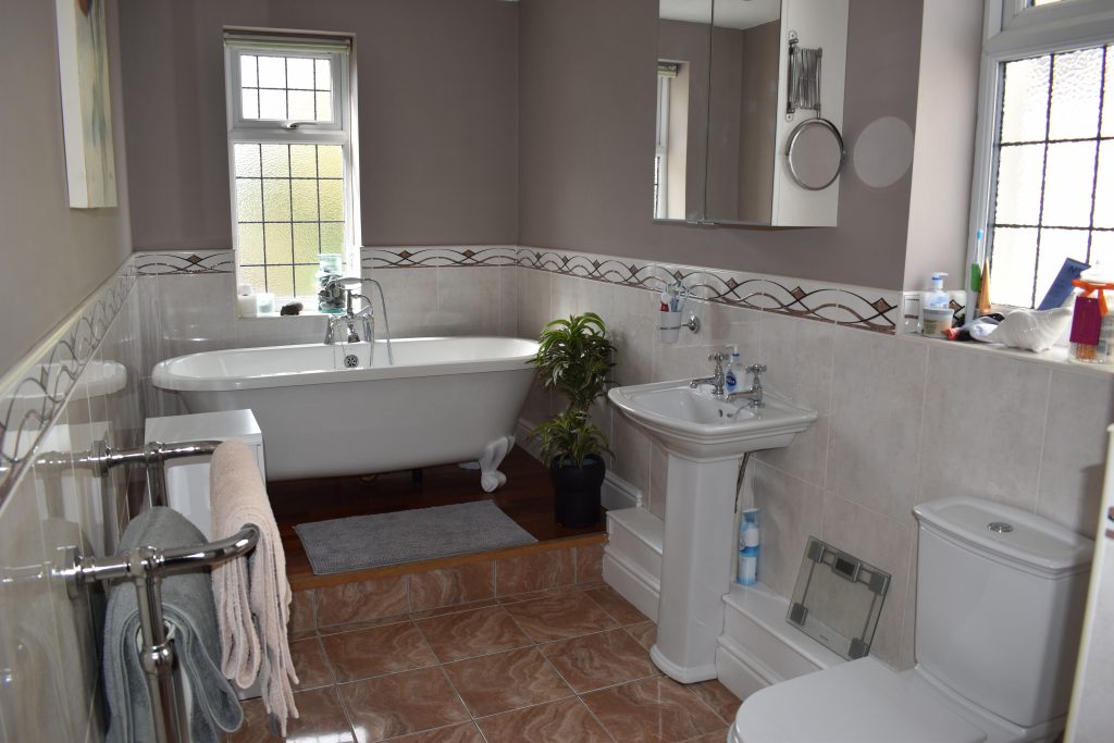 With two UPVC double glazed opaque leaded windows, four piece bathroom suite with claw footed bath with telephone mixer taps, pedestal wash hand basin, closed coupled W.C, separate shower cubicle, ceramic tiled floor, part wall tiling and ceiling light point.