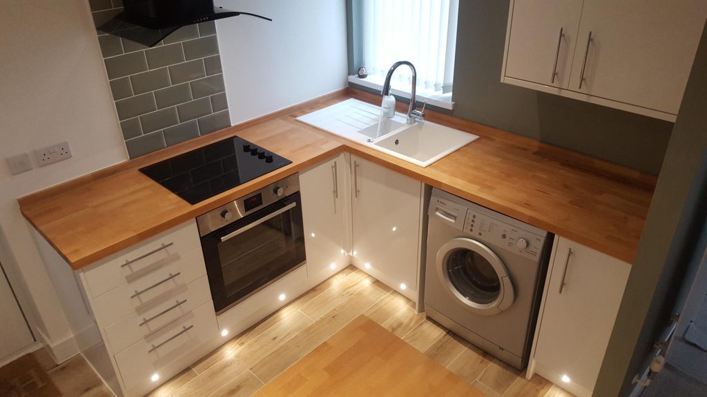 With white gloss wall and base units with kick plinth lighting, white composite sink, double glazed window to the front, part wall tiling, integrated oven, ceramic hob with extractor over, space and plumbing for washing machine, ceiling spot lights, power points, radiator and composite door to side of the property.