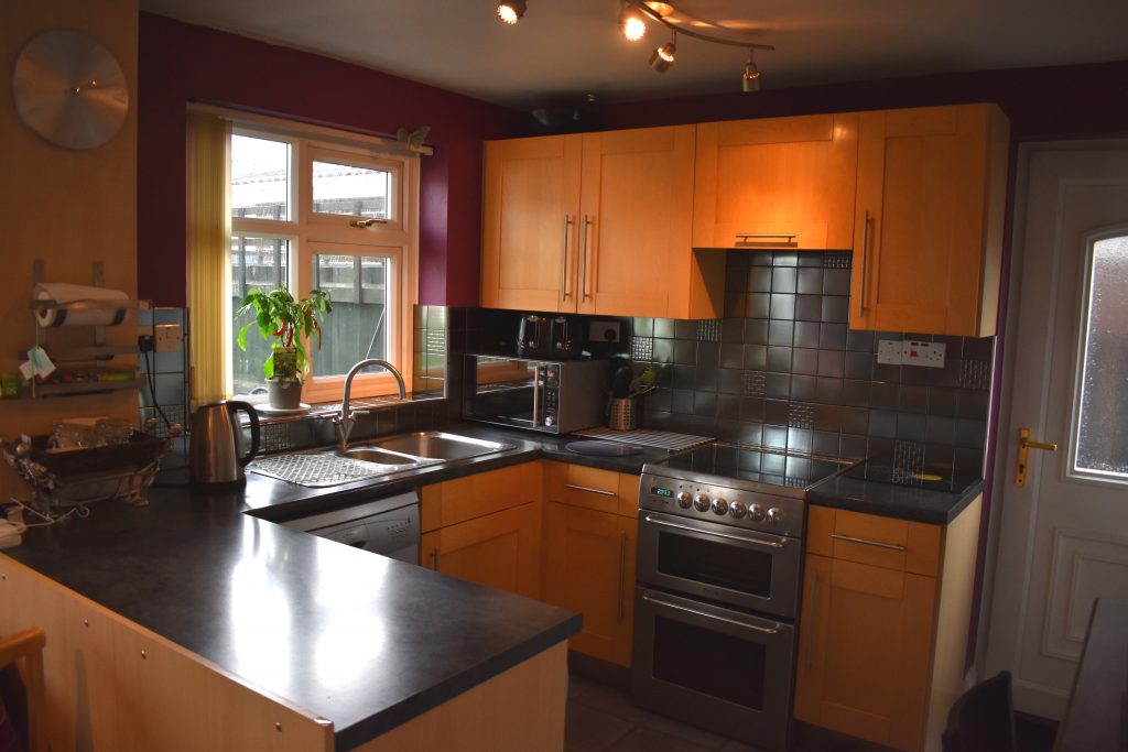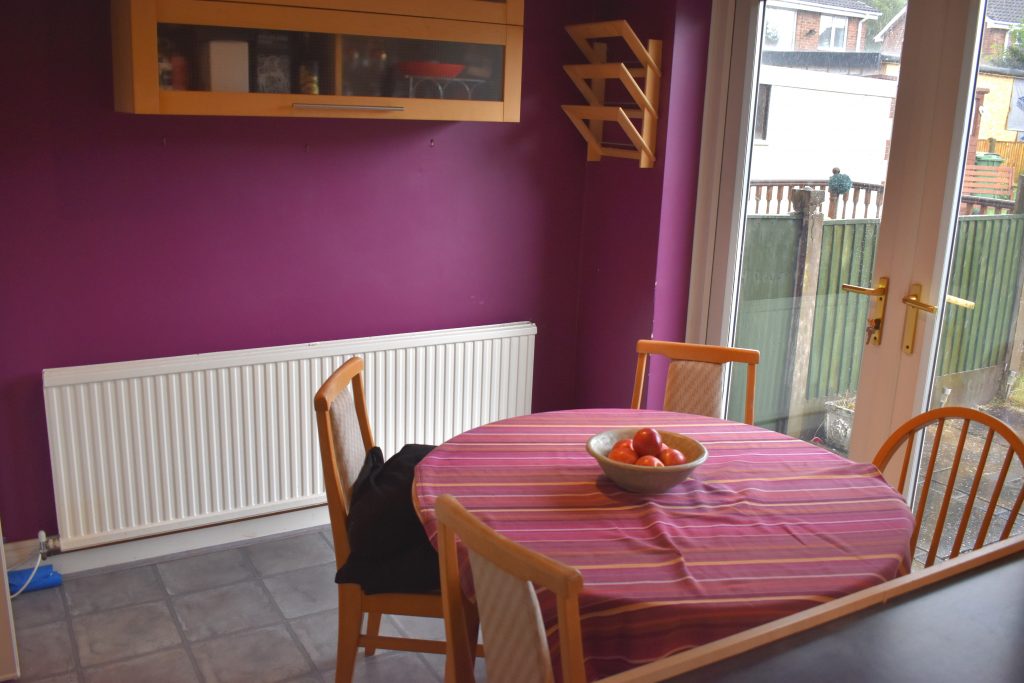 The dining kitchen is the perfect space for family meals, with patio doors opening onto the rear garden, ideal for the summer months. The kitchen is fitted with a range of maple-coloured wall and base units with co-ordinating roll-top work surfaces and wall tiling. With one and a half bowl stainless steel sink with chrome mixer tap, cooker with illuminated extractor, space and plumbing for dishwasher, space and plumbing for washing machine, UPVC double glazed window to the rear, UPVC double glazed door to the side, ceiling light points, thermostatically controlled radiator and power points. There is also a door to a useful understairs storage cupboard.