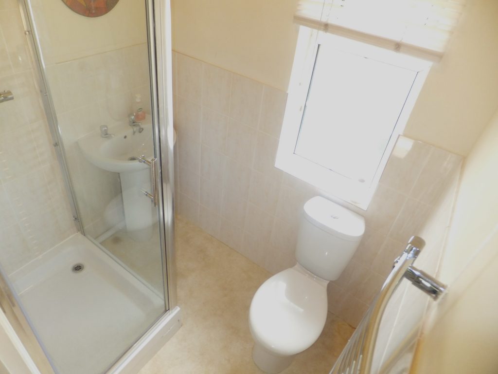 UPVC Double Glazed Opaque Georgian style window to the rear, half wall tiling, new three-piece suite in white comprising pedestal wash hand basin, close coupled W.C, shower cubicle with chrome shower and towel rail radiator.