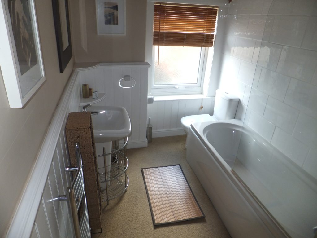 With a three piece white suite comprising; panelled bath with tiled surround, chrome mixer taps with adjustable shower head, shower screen, close coupled WC, pedestal wash hand basin, chrome towel rail radiator and UPVC double glazed opaque window to the rear.