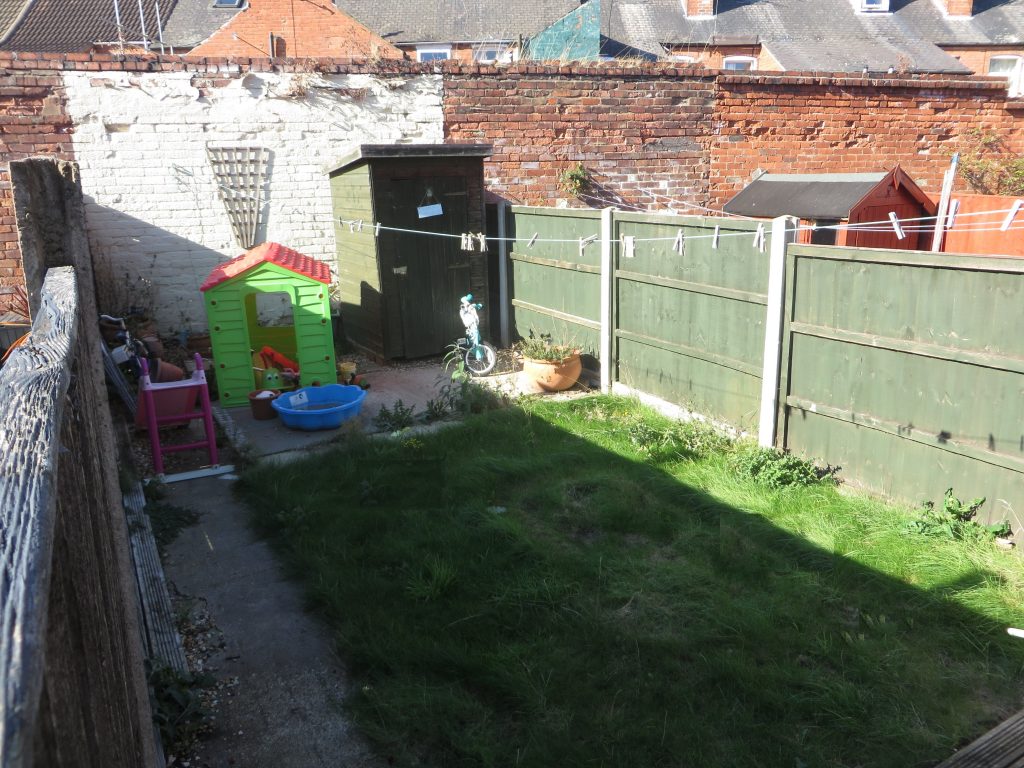 There is a terraced decked seating area, pathway, lawn, a small garden shed, an outside tap and an outside light.