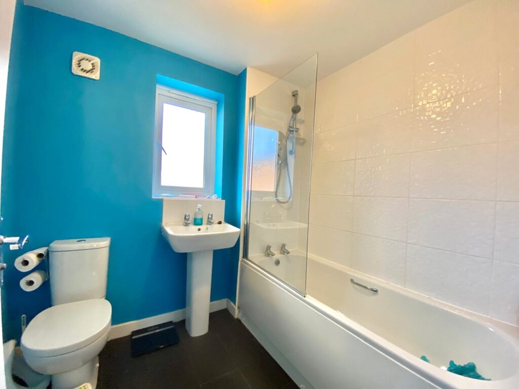 With three-piece white suite comprising close coupled W.C, pedestal wash hand basin with white tiled splashbacks, panelled bath with shower over and matching tiled walls, UPVC double glazed opaque window to the front, thermostatically controlled radiator, extractor fan and ceiling light point.