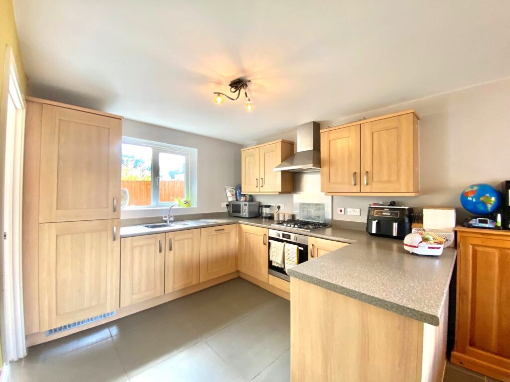 This open-plan, modern kitchen is fully-fitted and offers ample room for family dining; boasting multiple wall and base units for storage, roll top work surfaces, a 1 ½ bowl stainless steel sink with mixer tap, an integrated oven, four-ring gas hob with stainless steel splashback and extractor hood over, integrated fridge-freezer, integrated dishwasher, UPVC double glazed windows to the front and rear, storage cupboard, two thermostatically controlled radiators, two ceiling light points, numerous power points and access to the utility room.
