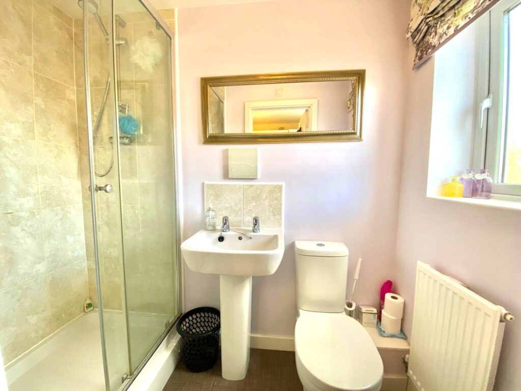 Having a three-piece white suite comprising close-coupled W.C. with eco-flush function, pedestal wash hand basin with marble-effect tiled splashbacks, shower cubicle with matching wall tiling, UPVC double glazed opaque window to the front, thermostatically controlled radiator, extractor fan and ceiling light point.