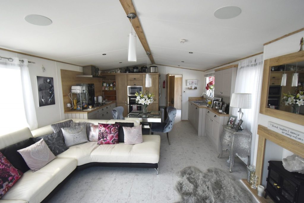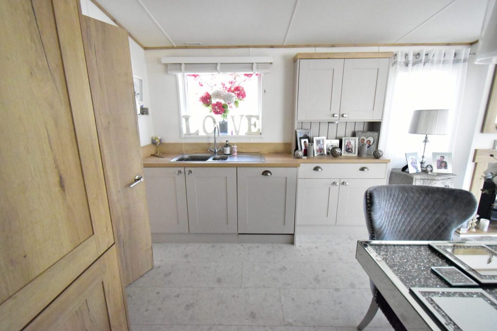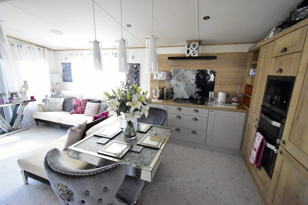 With a range of matching wall and base units, coordinating wooden work surfaces, 1 ½ sink with mixer tap, five ring gas hob with extractor fan over, various integrated appliances to include oven and grill, microwave, fridge-freezer and dishwasher, power points and feature ceiling light point and spotlights.