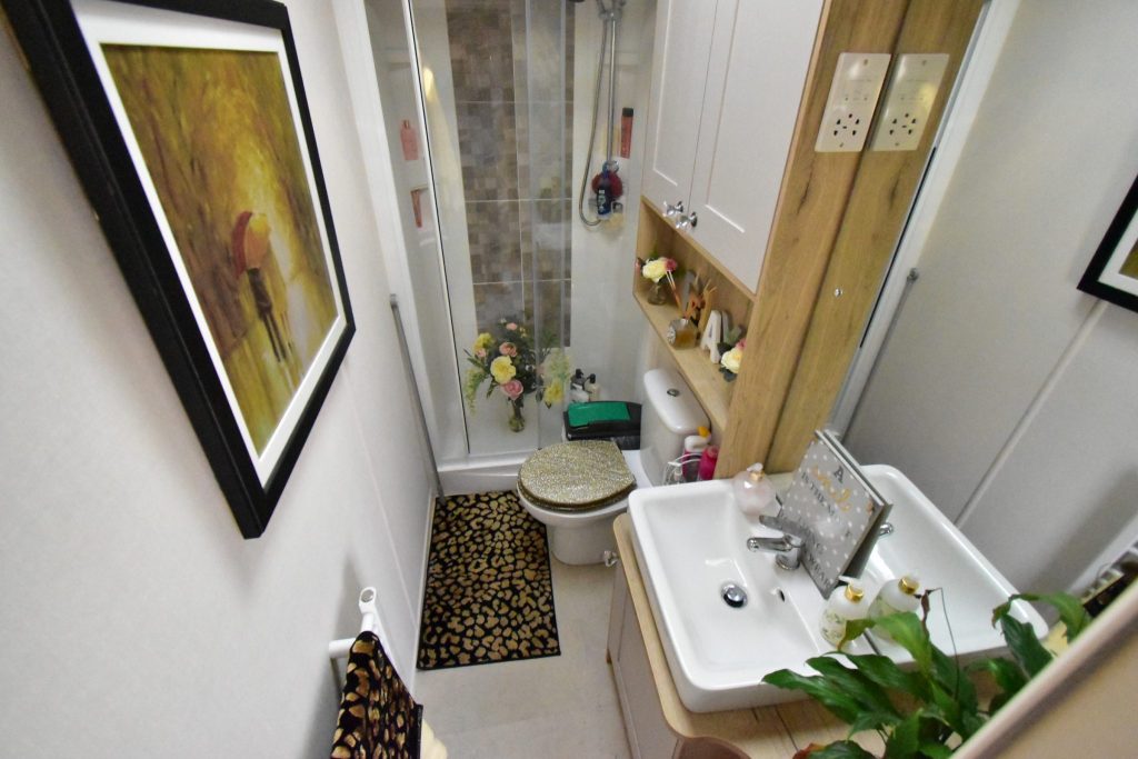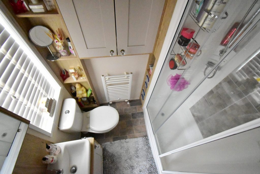 With three piece white suite comprising close coupled W.C, pedestal wash hand basin with mixer tap set into vanity unit, shower enclosure, towel rail radiator, UPVC double glazed window and ceiling light point.
