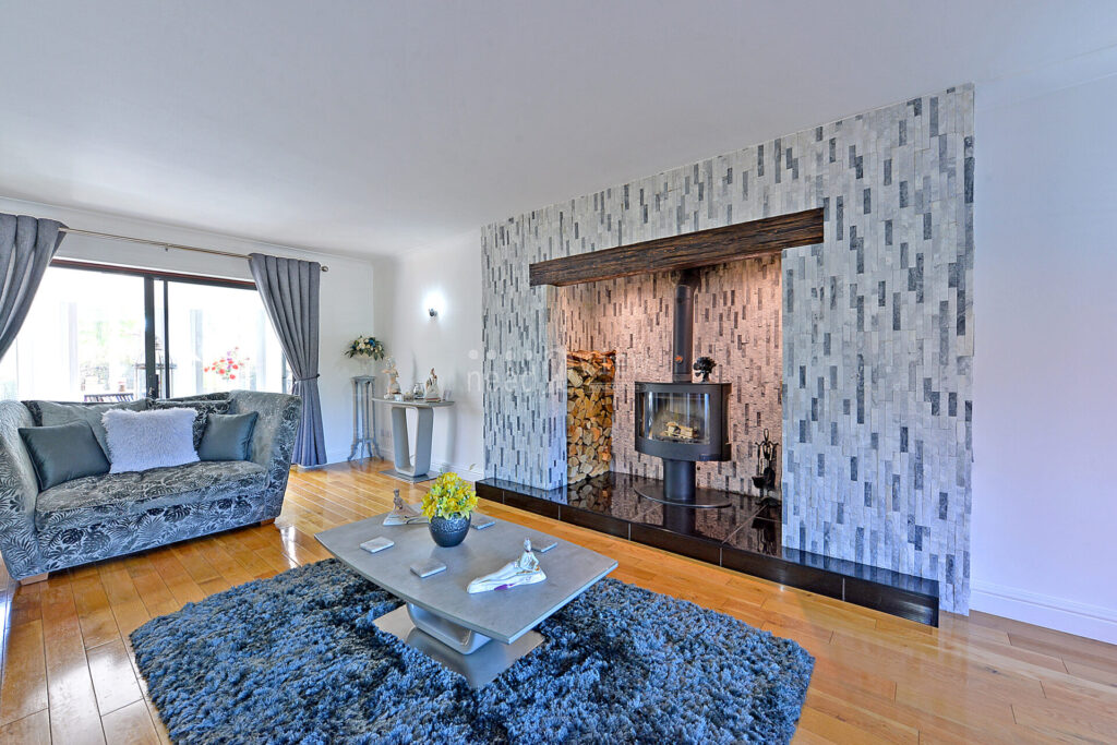The sitting area consists of a feature log burner, spacious family room with UPVC triple glazed bay window to the front elevation, double glazed sliding patio doors to the rear, log fire with brick surround, thermostatically controlled radiator, power and ceiling light points.