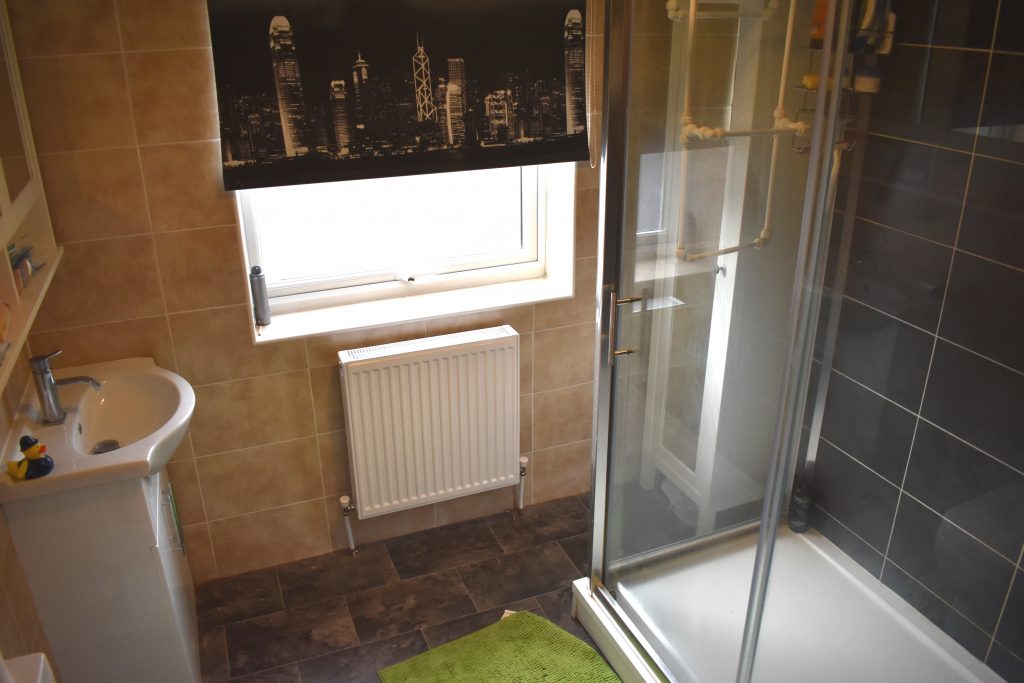 Fitted with a modern suite comprising double shower enclosure with a wash hand basin set into a vanity unit and close coupled W.C. UPVC double glazed opaque window to the front, radiator, wall tiling, ceiling light point and extractor.