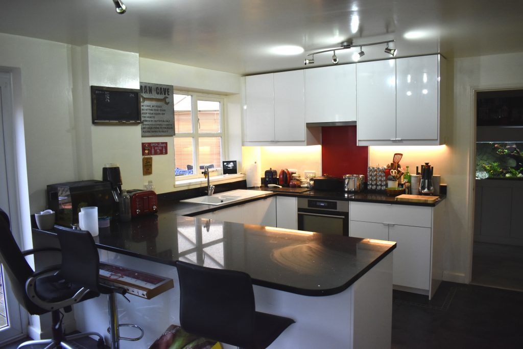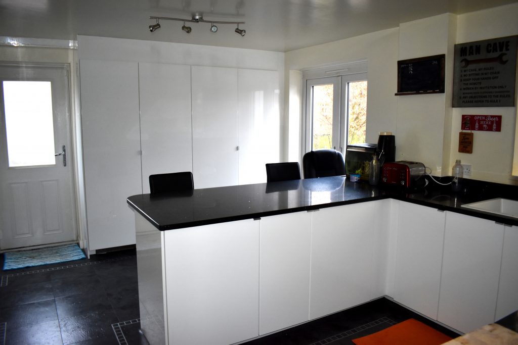 The kitchen has been refitted with a range of modern wall and base units in a white gloss finish with granite work surfaces and a breakfast bar. With a four-ring electric hob, extractor, integrated oven, power points, ceiling light point and wooden double-glazed window to the rear.